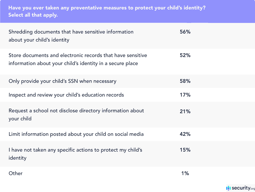 Regardless of the level of concern regarding child identity theft, most parents reported that they shred documents with their children’s PII, store these types of documents and electronic records securely, and only provide their children’s SSNs when necessary. However, 15 percent of parents didn’t take any action to prevent child identity theft, which is striking considering its potential consequences.