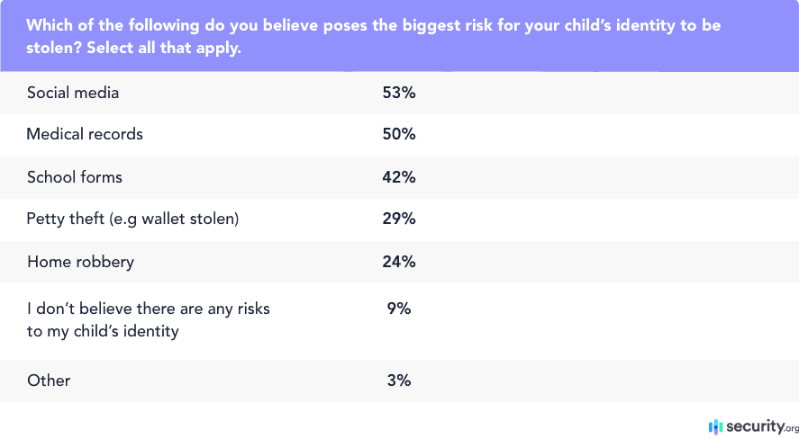 Nearly two-thirds of parents are concerned about child identity theft, with the most frequently cited risks being social media, medical records, and school forms. Interestingly, about a third of parents were either not so concerned or not at all concerned about child identity theft, even though most parents do take measures to prevent their children’s identities from being stolen.