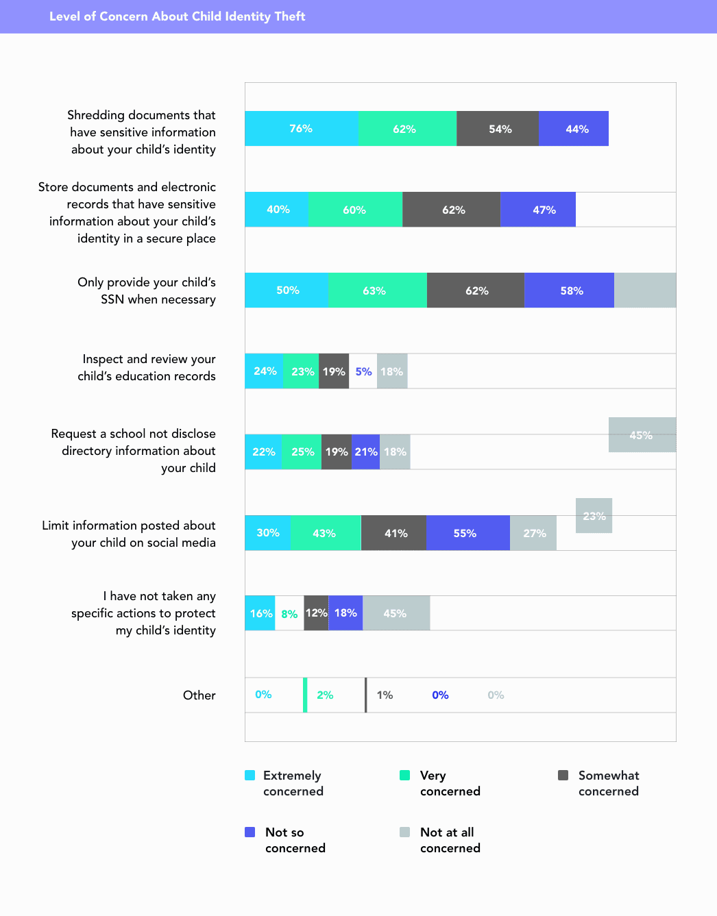 Even parents who were not at all concerned about child identity theft take preventative measures to protect their children’s PII; 45 percent shredded documents that contained sensitive information and only provided their child’s SSN when necessary. Parents that fell in this not so concerned group were also more likely than more concerned parents to limit information posted about their children on social media, which was counterintuitive, seemingly. Why aren’t more concerned parents supervising and controlling information about their kids on social networks like Facebook, Instagram, and the increasingly popular Tik Tok?