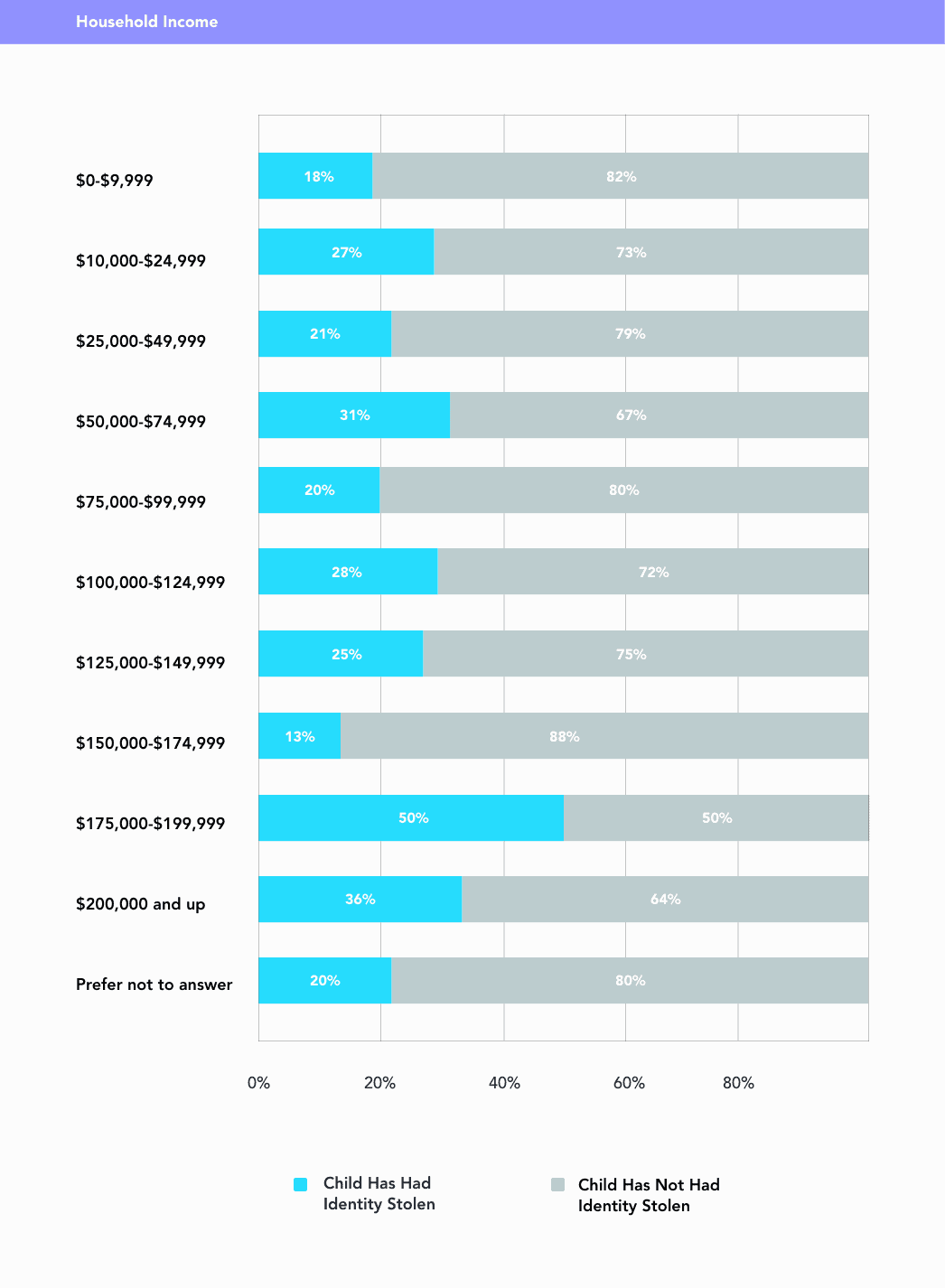 At the beginning of our research, we hypothesized that parents with larger household incomes would be more likely to report child identity theft, as thieves would rather steal from more affluent people versus less affluent. This proved to be the case for the highest household income brackets on our survey, $175,000, and up. On average, 43 percent of parents of these household income brackets reported child identity theft, higher than the average reported child identity theft of 23 percent from households with incomes of $174,999 and below. While household income and reports of child identity theft weren’t perfectly correlated, in general, parents of children from households with higher income brackets were more likely to report child identity fraud than parents of children from households with lower income brackets.
