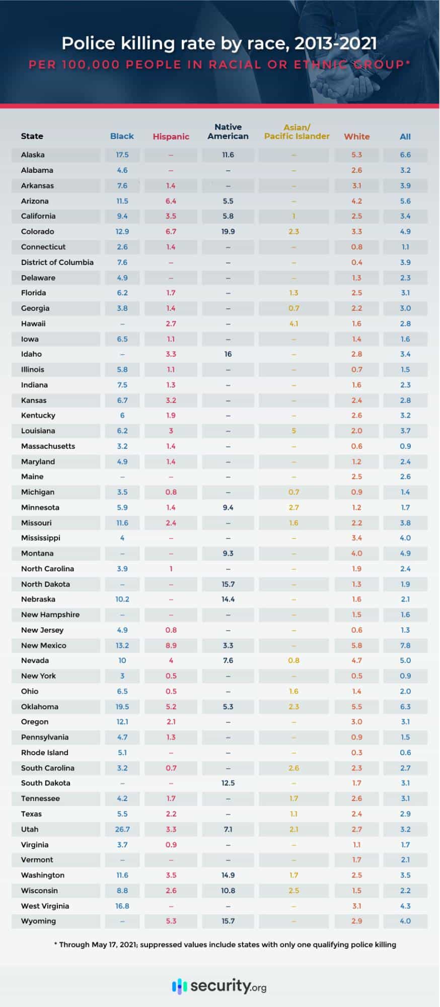 Colorado, Idaho, North Dakota, Nebraska, South Dakota, and Washington all have disparities between the rates of killings of Native Americans and white people, though fewer states had qualifying incidents. To avoid skewing data too heavily, we excluded states that had only one police killing of someone in the ethnic group.