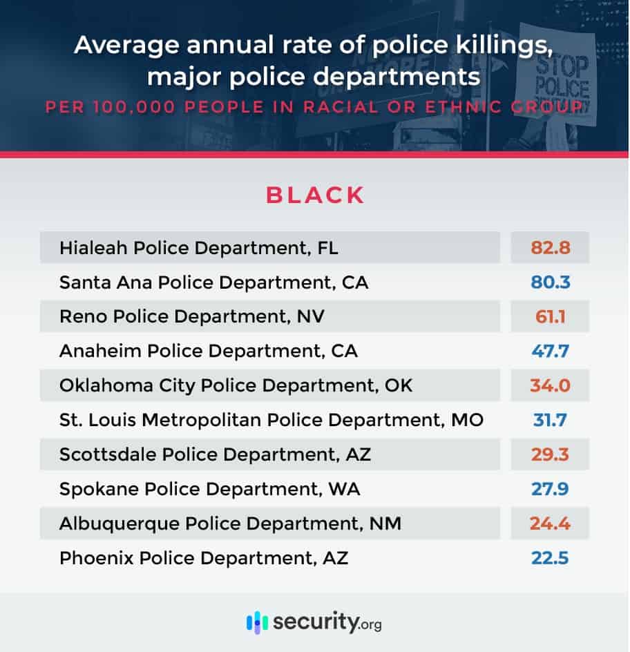 In the U.S., homicide generally occurs at a rate of about 5 per 100,000 people, but many police departments’ rates of police killings far exceed that for certain ethnic groups.