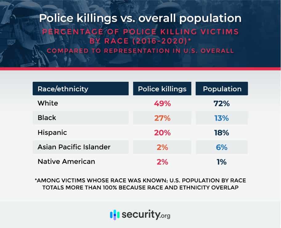 Black Americans make up about 13 percent of the U.S. population, but they account for more than 1 in 4 people killed by police. Hispanic and Native American people are also overrepresented in police killings. Asian/Pacific Islanders and whites are the only ethnic groups underrepresented in police killings.