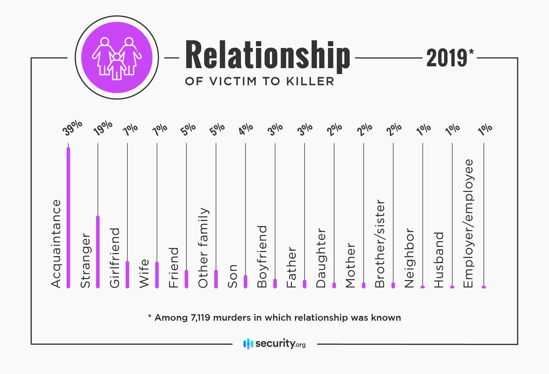 In all 7,119 cases, the most common relationship between the suspect and the victim are acquaintances – they are either workmates, friends, business partners, and so on. That was the case for 39 percent of the 7,119 murders. On the other hand, in 19 percent of those cases, the killer is a stranger to the victim.