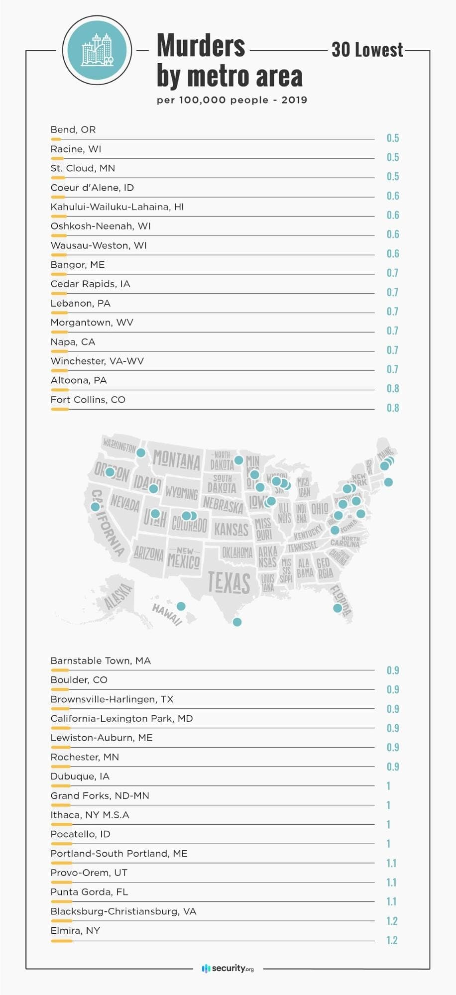 More than 200 of the cities and metro areas for which the FBI published data had lower murder rates than the U.S. overall, and several had either no murders or rates so low they couldn’t be effectively calculated. Wisconsin is home to three of the cities and metro areas (Racine, Oshkosh-Neenah, and Wausau-Weston) with the 10 lowest murder rates.