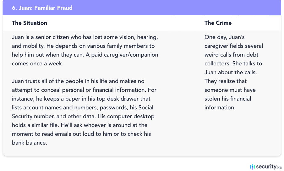 Familiar fraud, also called family member fraud, is very real. Some parents even steal their children’s identity, although not always with malicious intentions. For example, a parent might use a child’s information to procure goods or services that benefit the child. In Juan’s case, perhaps a relative stole his information to qualify for a loan to pay Juan’s bills—but it’s still illegal. Familiar fraud can be committed by relatives, friends, caregivers, co-workers, even neighbors.